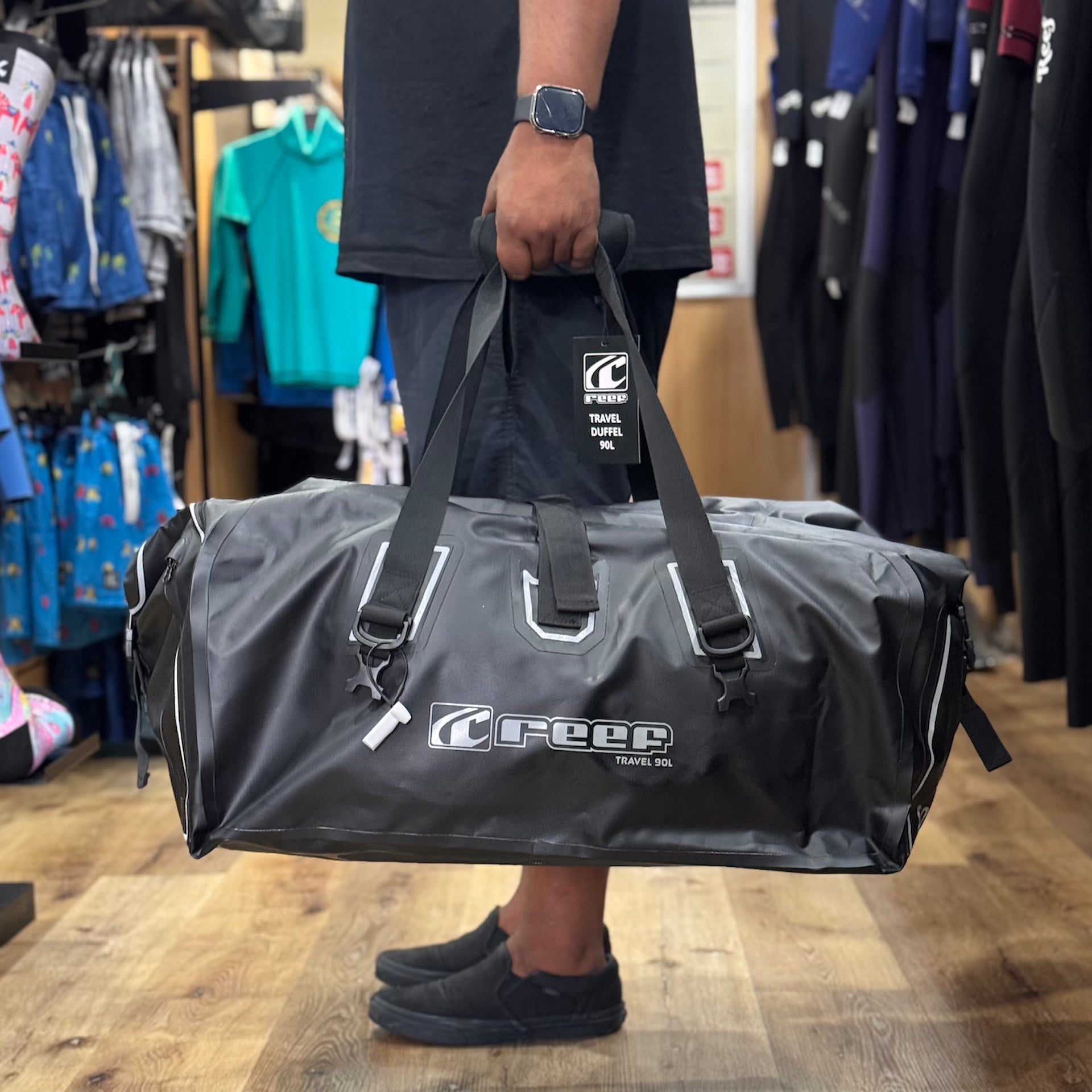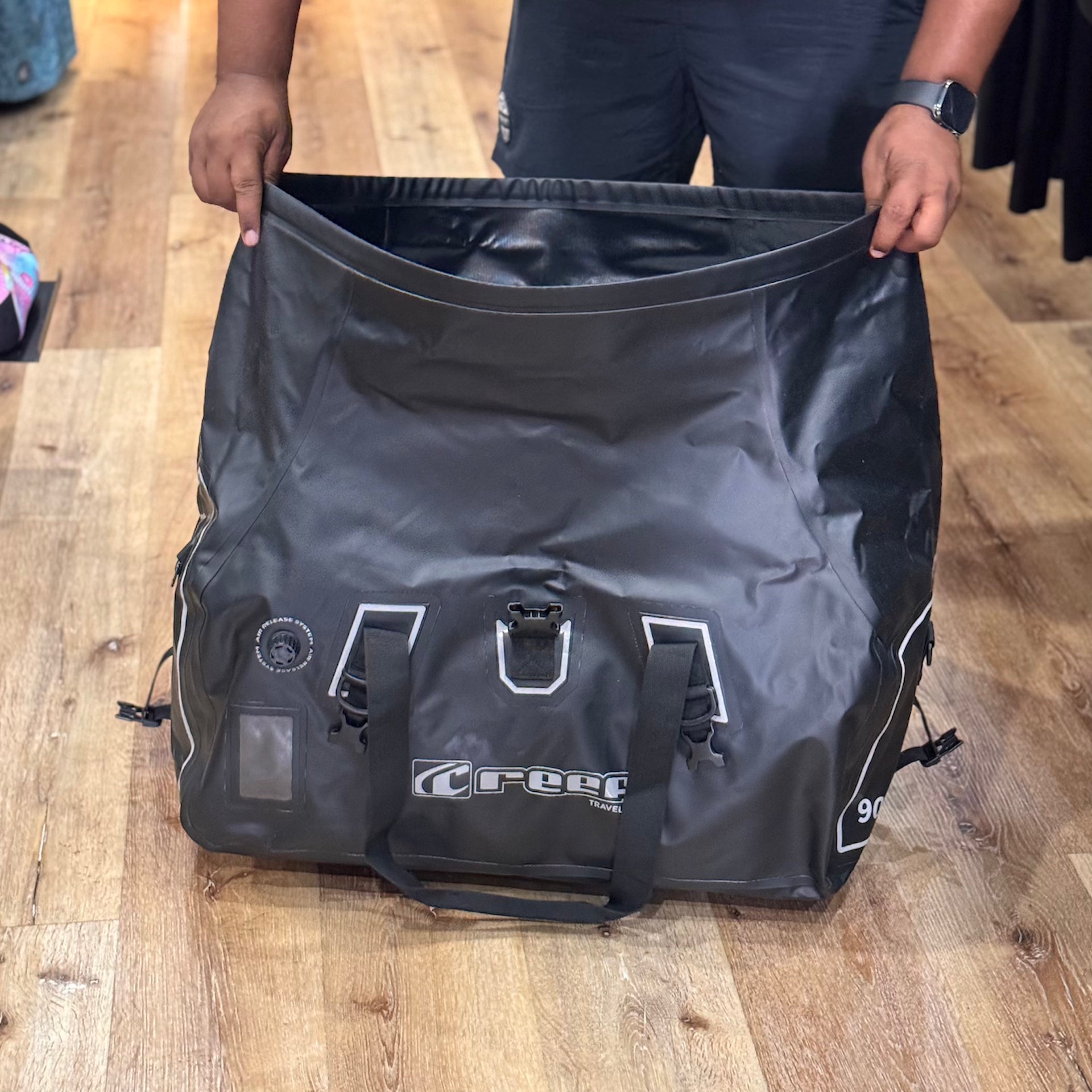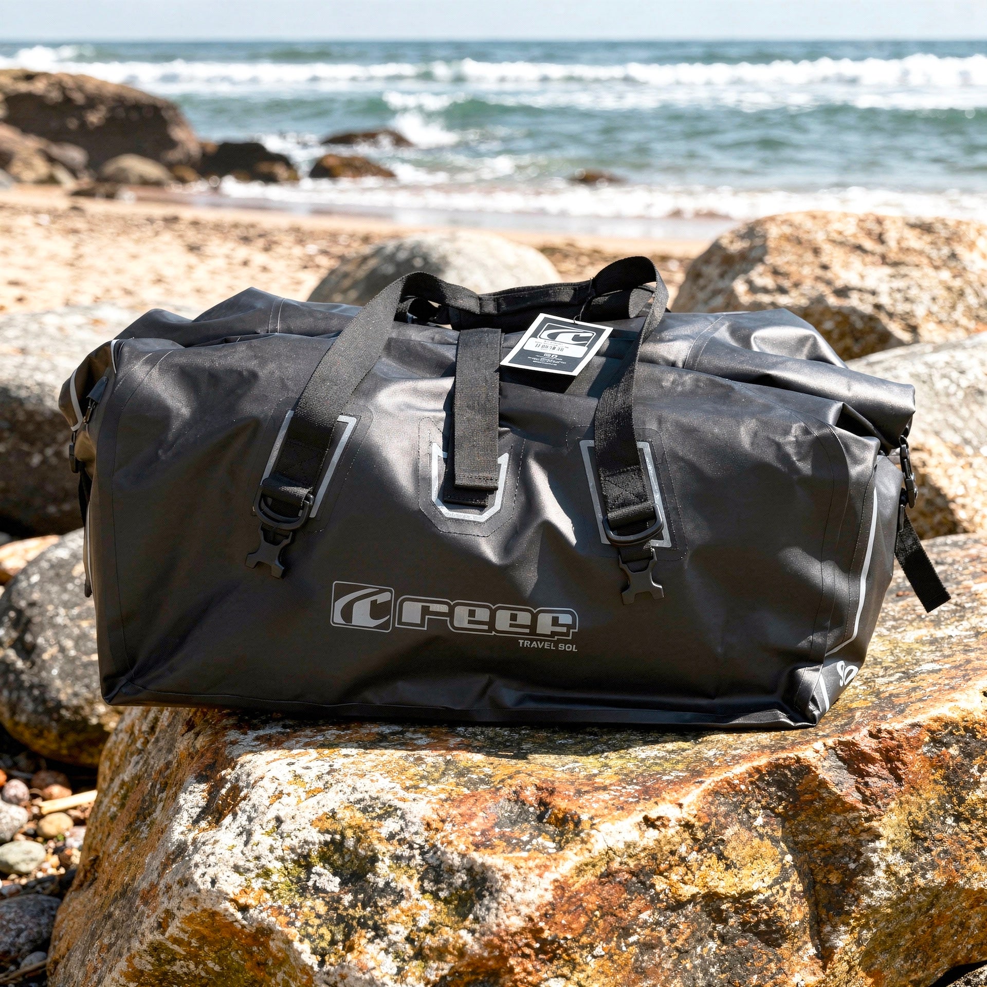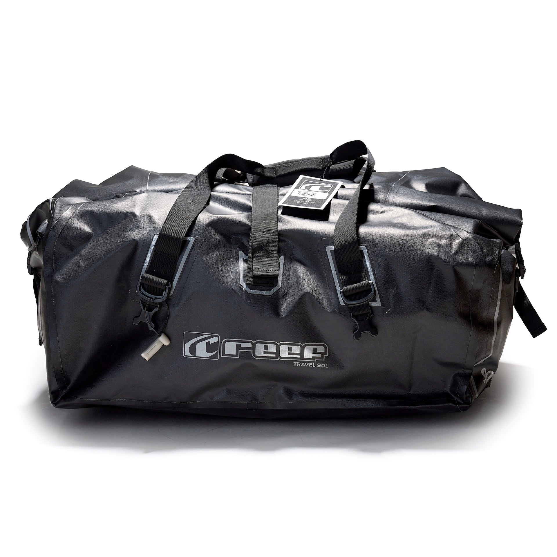 The Reef 90L Duffel Bag made from rugged PVC Duffel Dry Bag. The bag features improved styling and additional features like reinforced webbing mounts, a bag ID holder, reflective detail and an air valve for deflating the bag once sealed. Some features we've retained is the super durable PVC outer, multiple carry handles and straps and a dry bag style roll top.