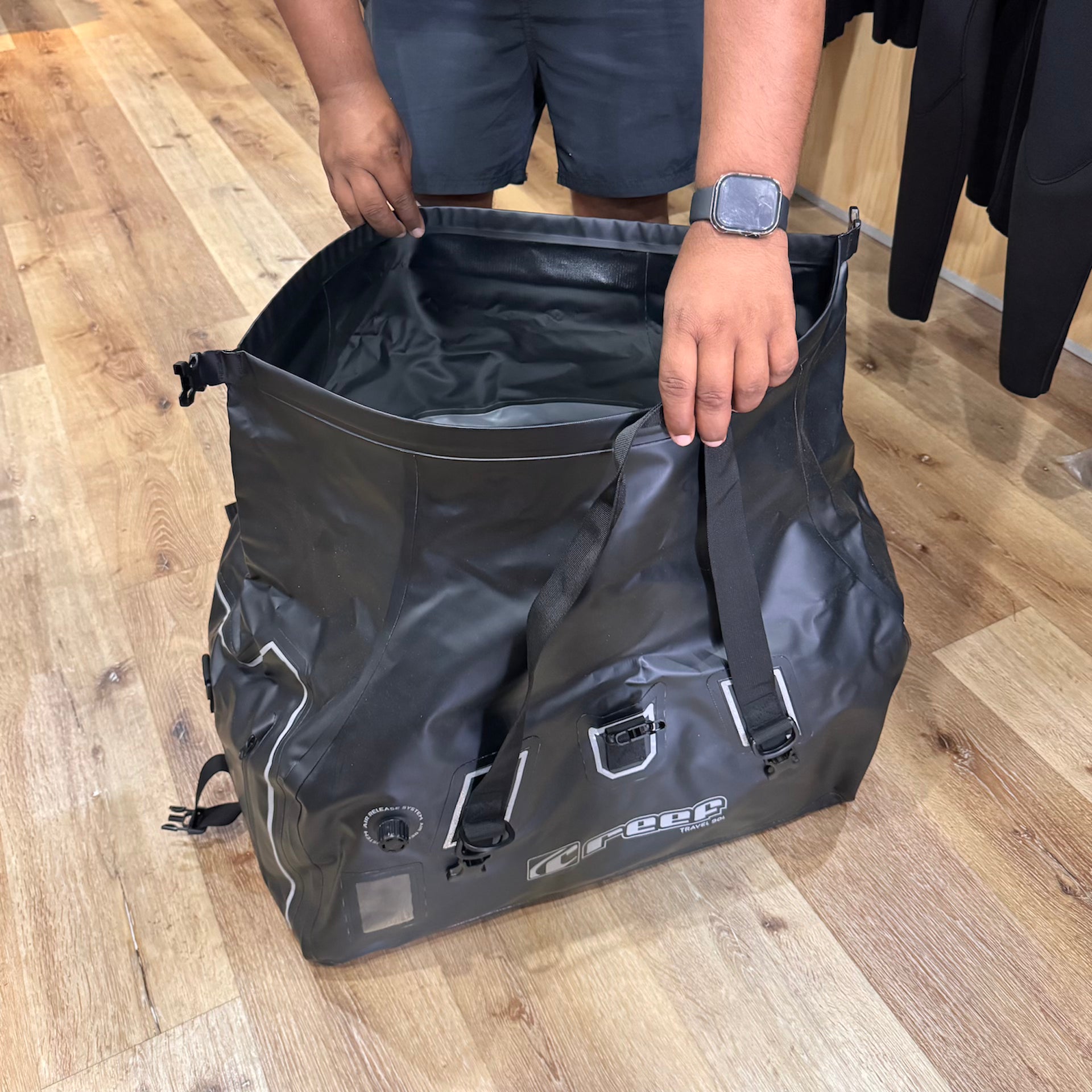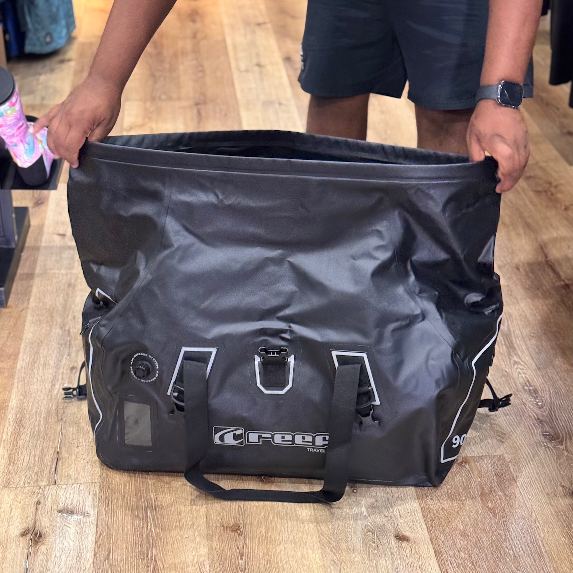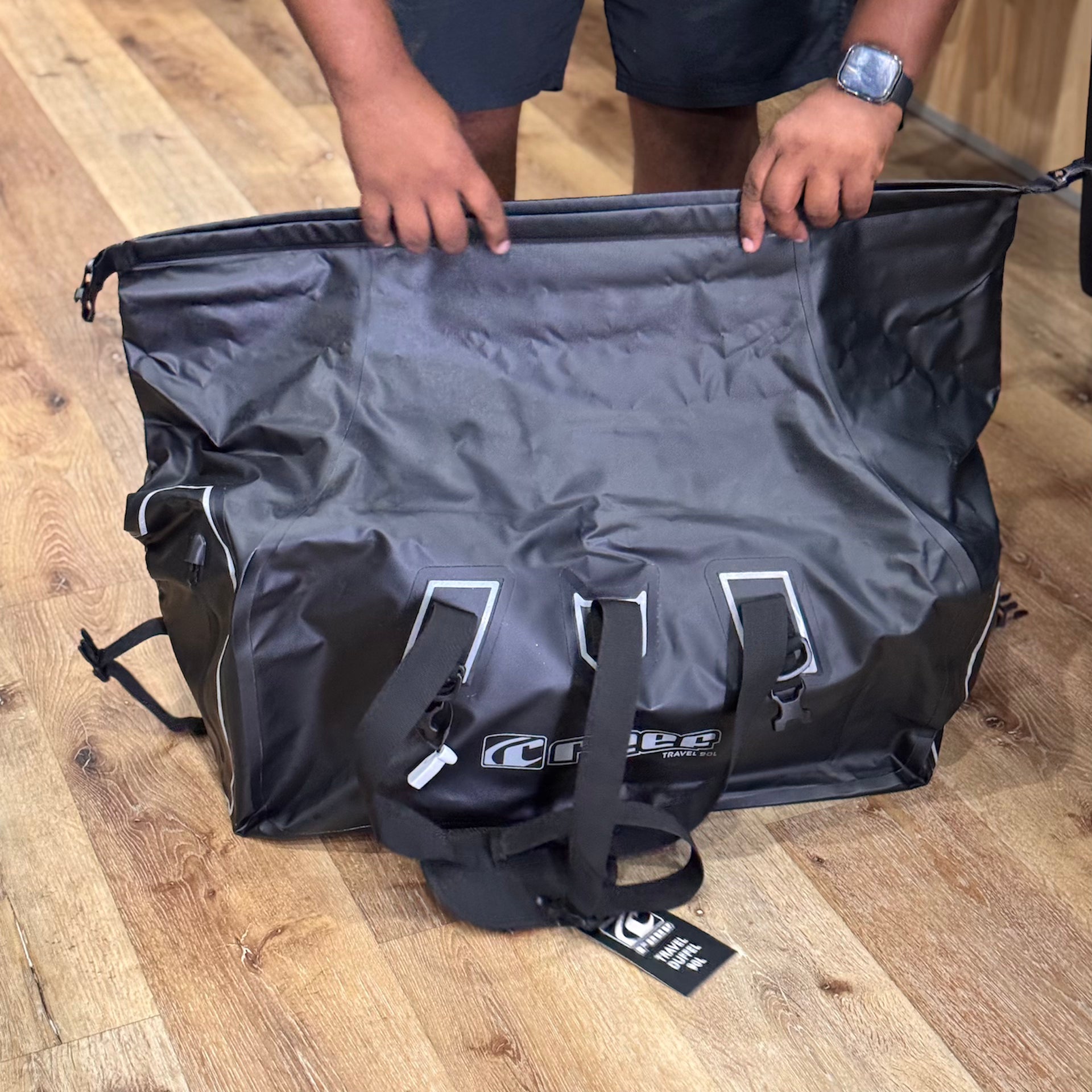 - 90L capacity roll top duffel