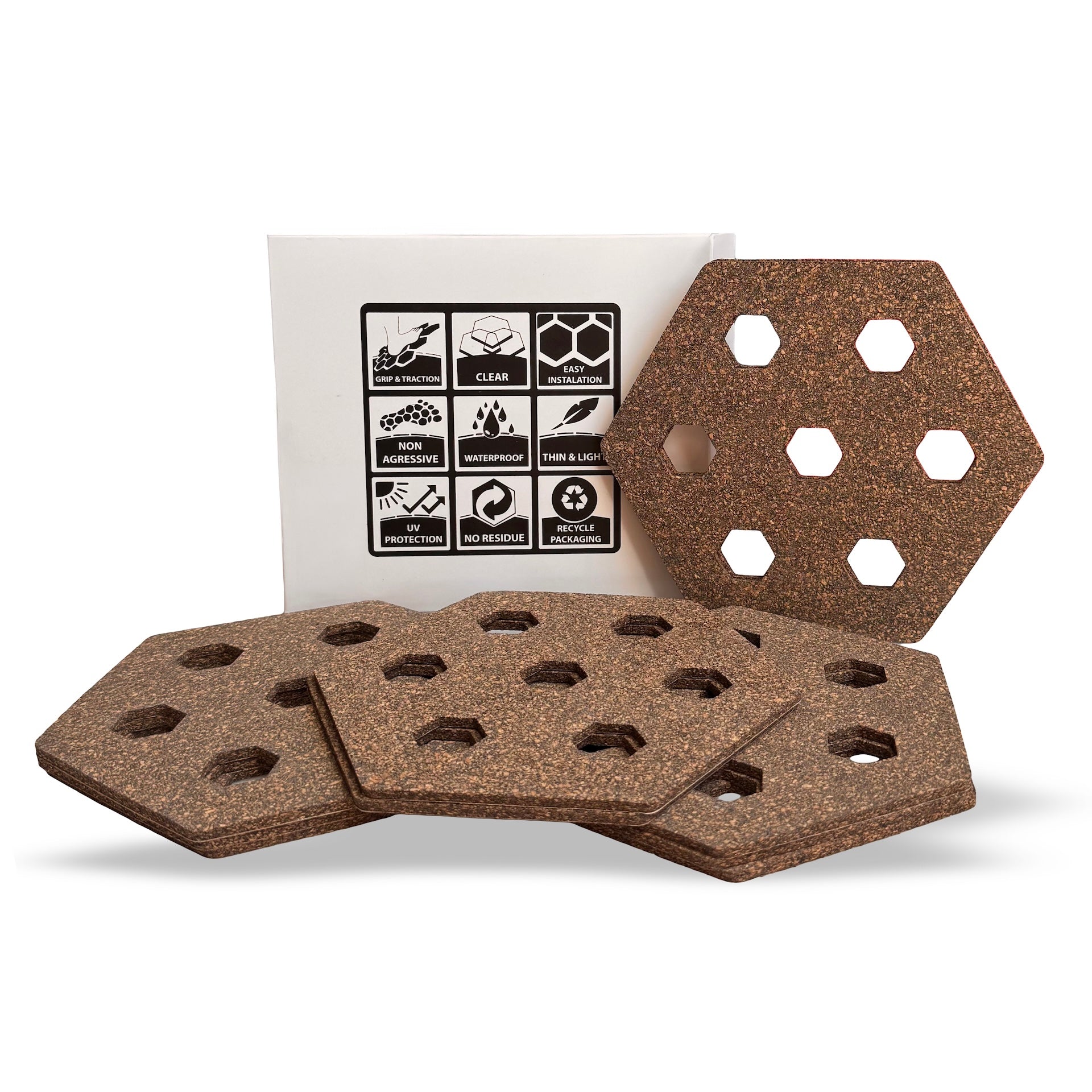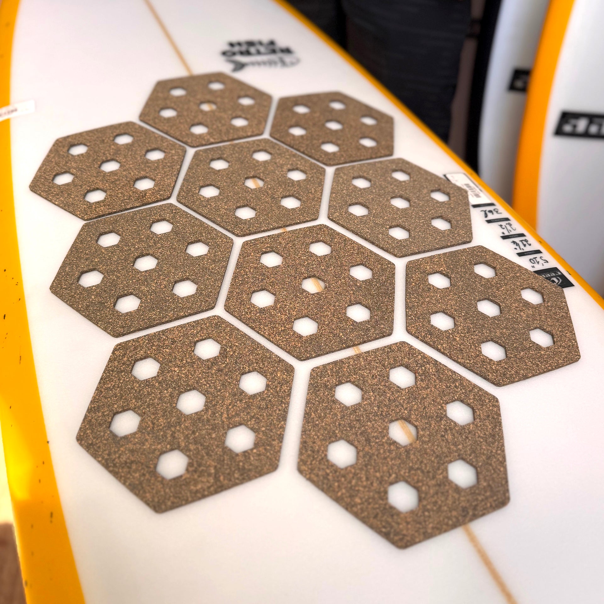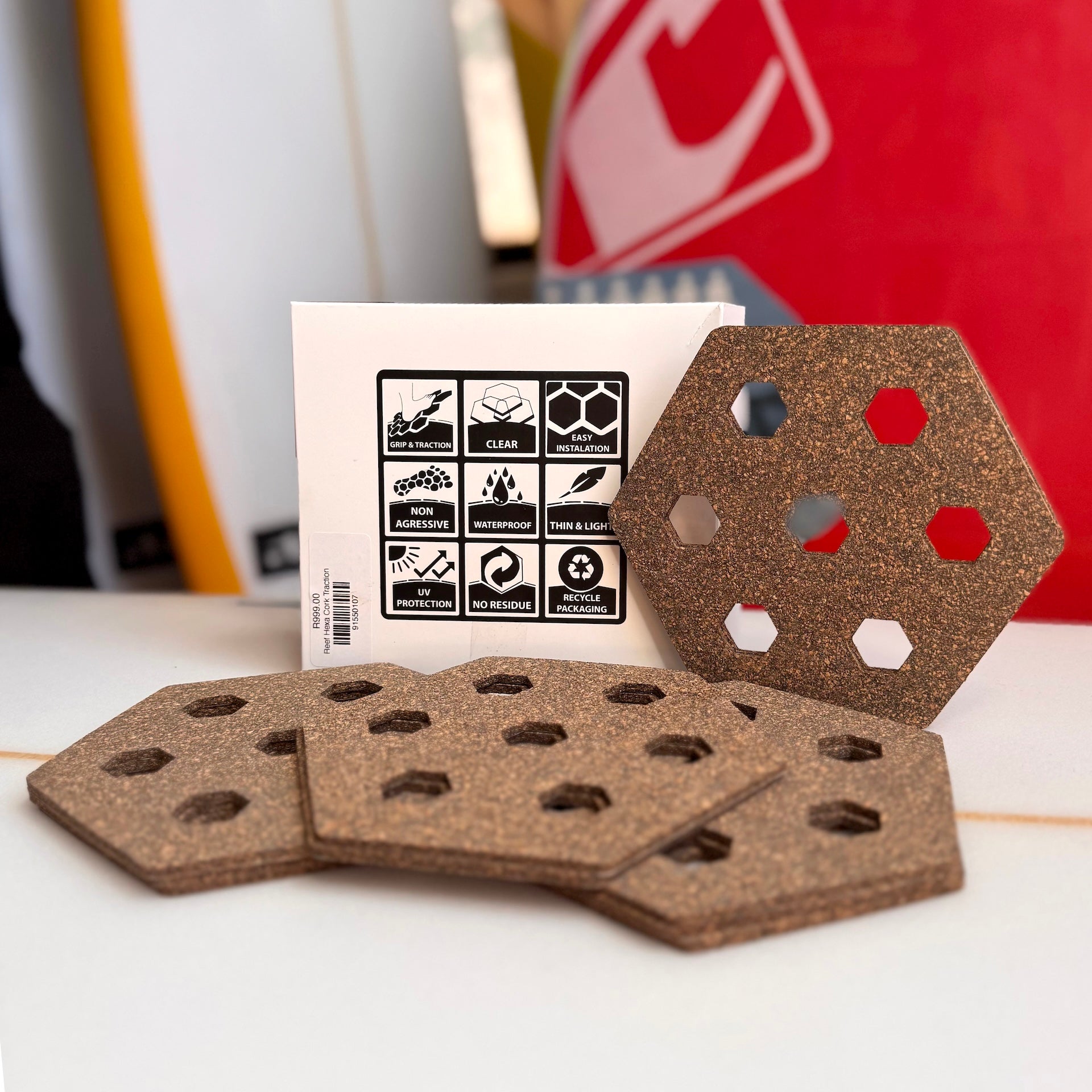 The Reef Hexa Traction is a waxless, modular grip system for surfboards, paddleboards, and other watercraft, that provides temperature-independent traction using interlocking hexagonal pads, eliminating messy surf wax, melting, and maintenance while protecting the board's deck. It's thin, light, UV-protected, waterproof, and offers a clean aesthetic.ย